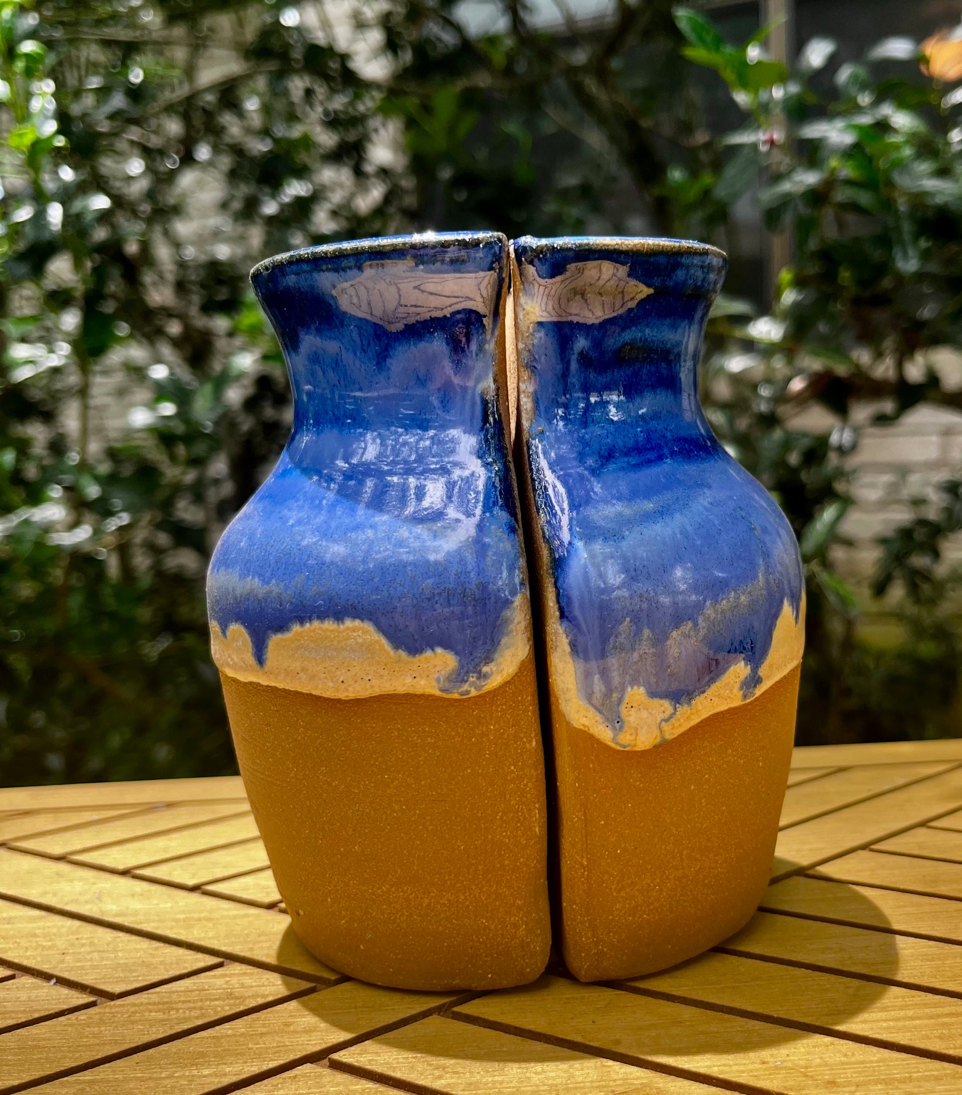 These wall hanging vases or cute book ends are fully glazed on the inside to hold fresh flowers in water or dried florals. (or pens or anything you think they should hold!)