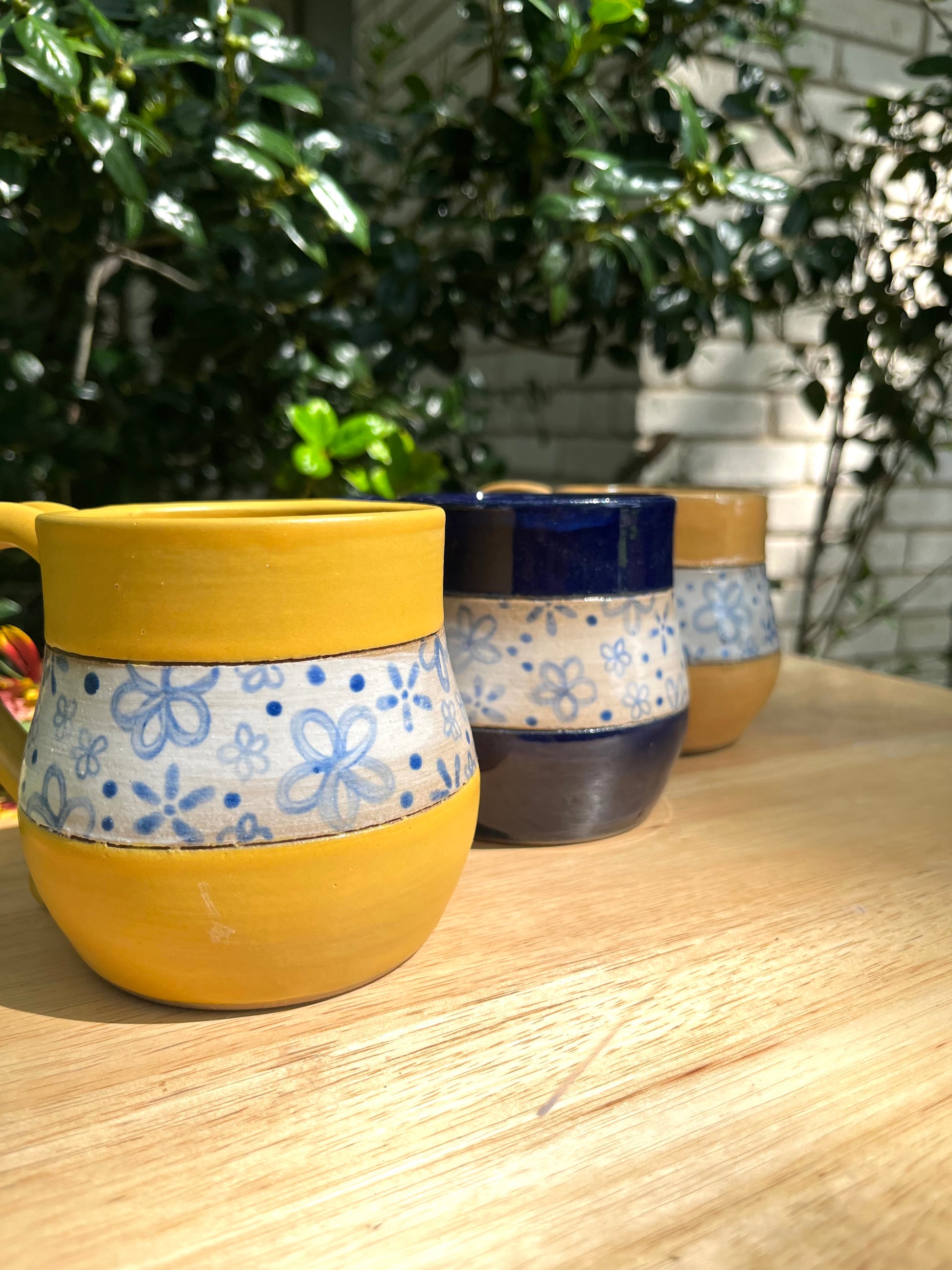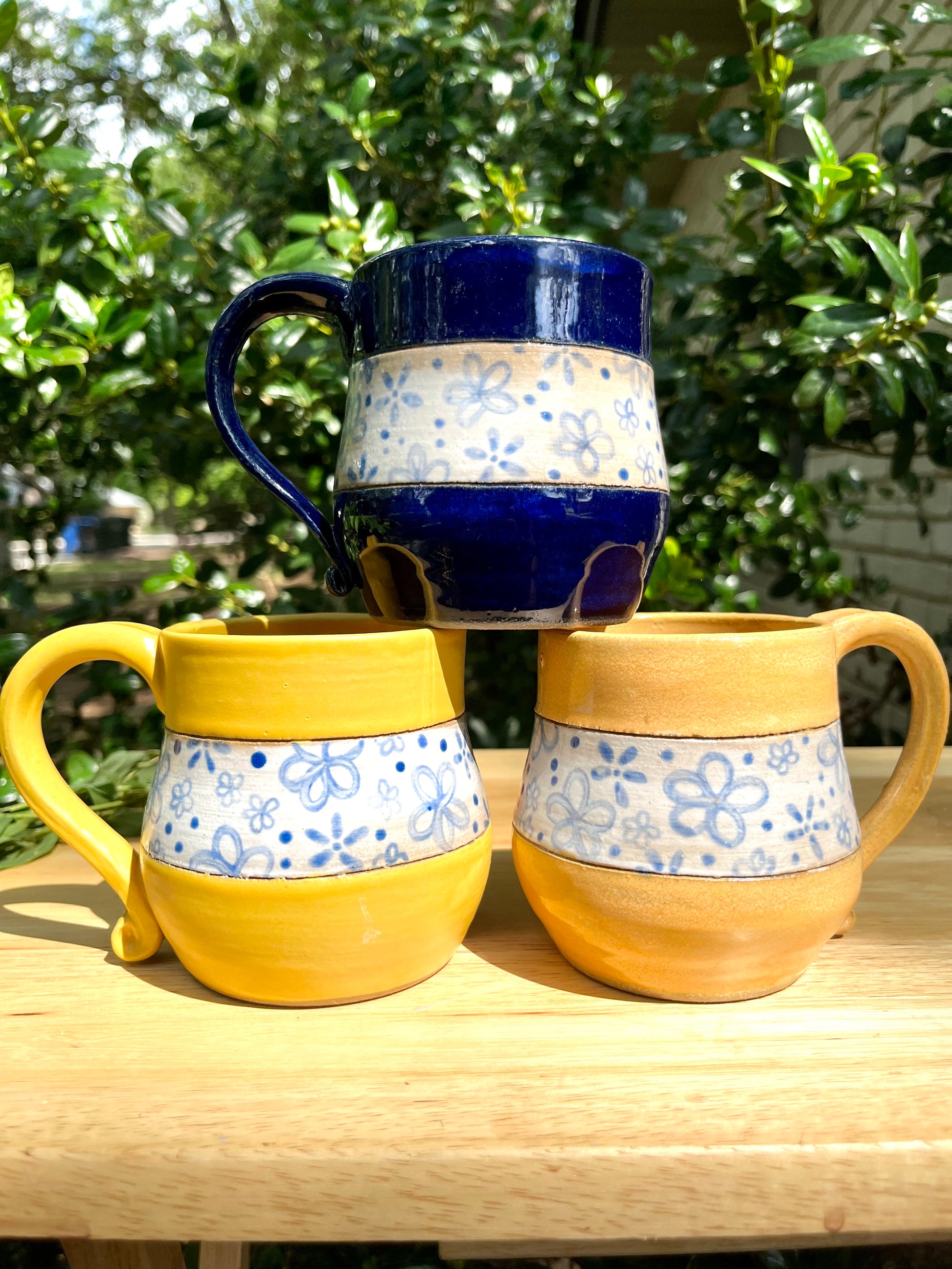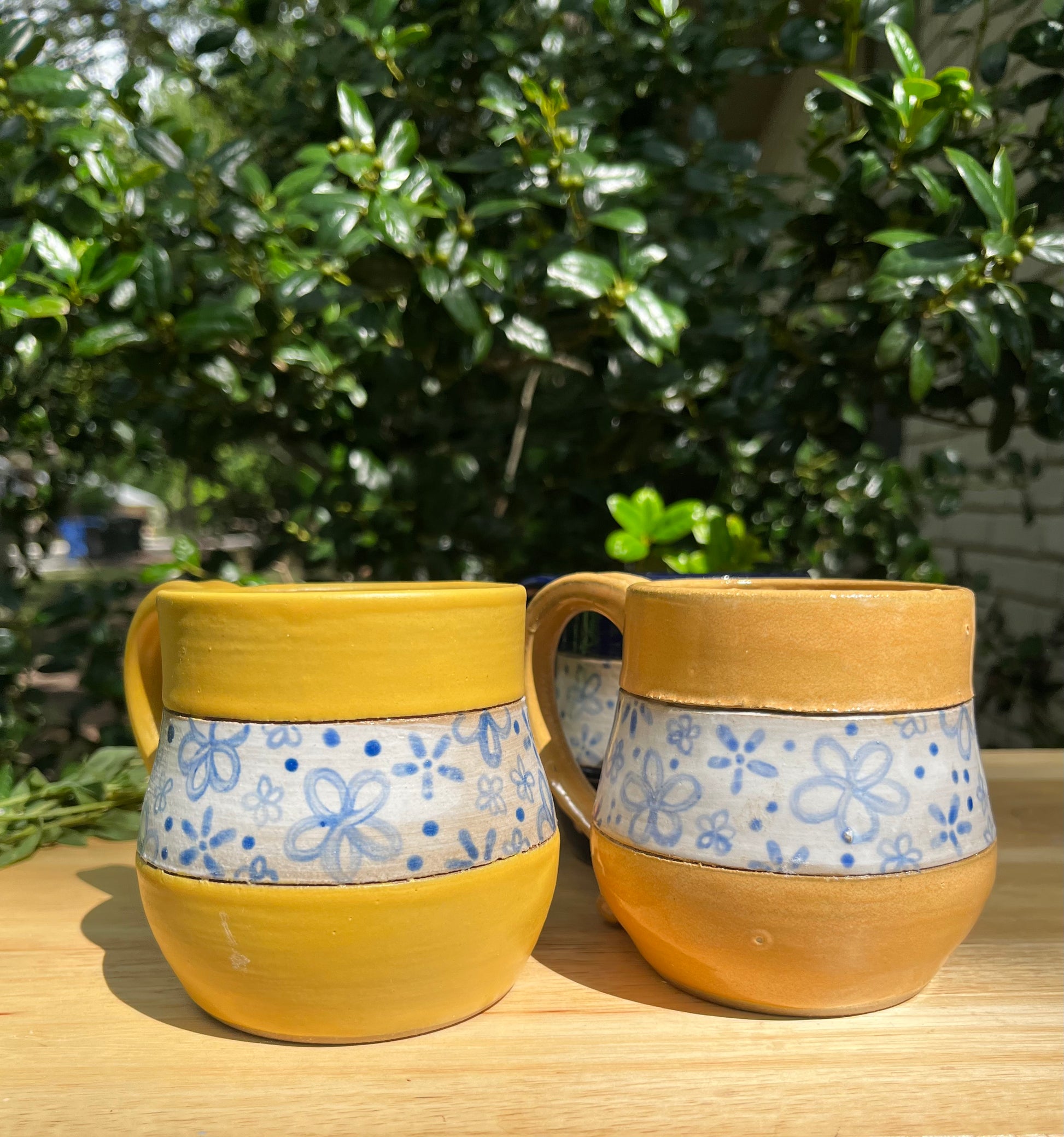 These new designs are hand thrown, hand painted and then fired to 2200* to give you the perfect cup of morning java. Each mug holds 13oz and is lead free, non toxic and dishwasher safe. The banding is hand painted with blue daisies and shows the imperfections of a maker's hand. Cottage core 5000