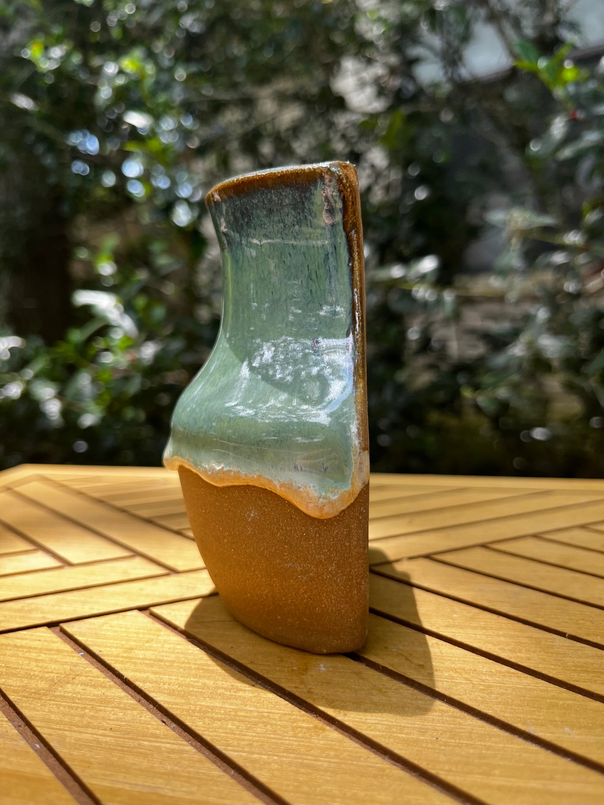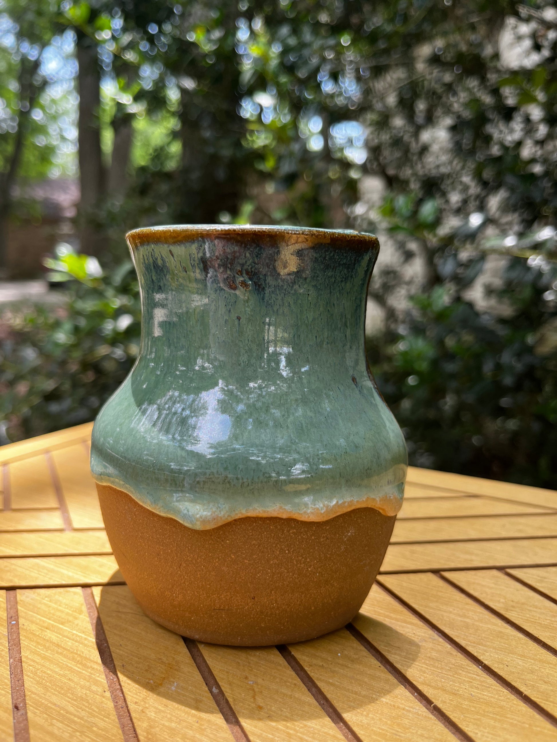 This thrown vase is flat on the back with a hole built in to be able to hand on your wall and fill with fresh or dried florals. Measuring 5" tall and 4" wide, the vase in fully glazed on the inside with safe glazes. Constructed of buffalo wallow stoneware clay.