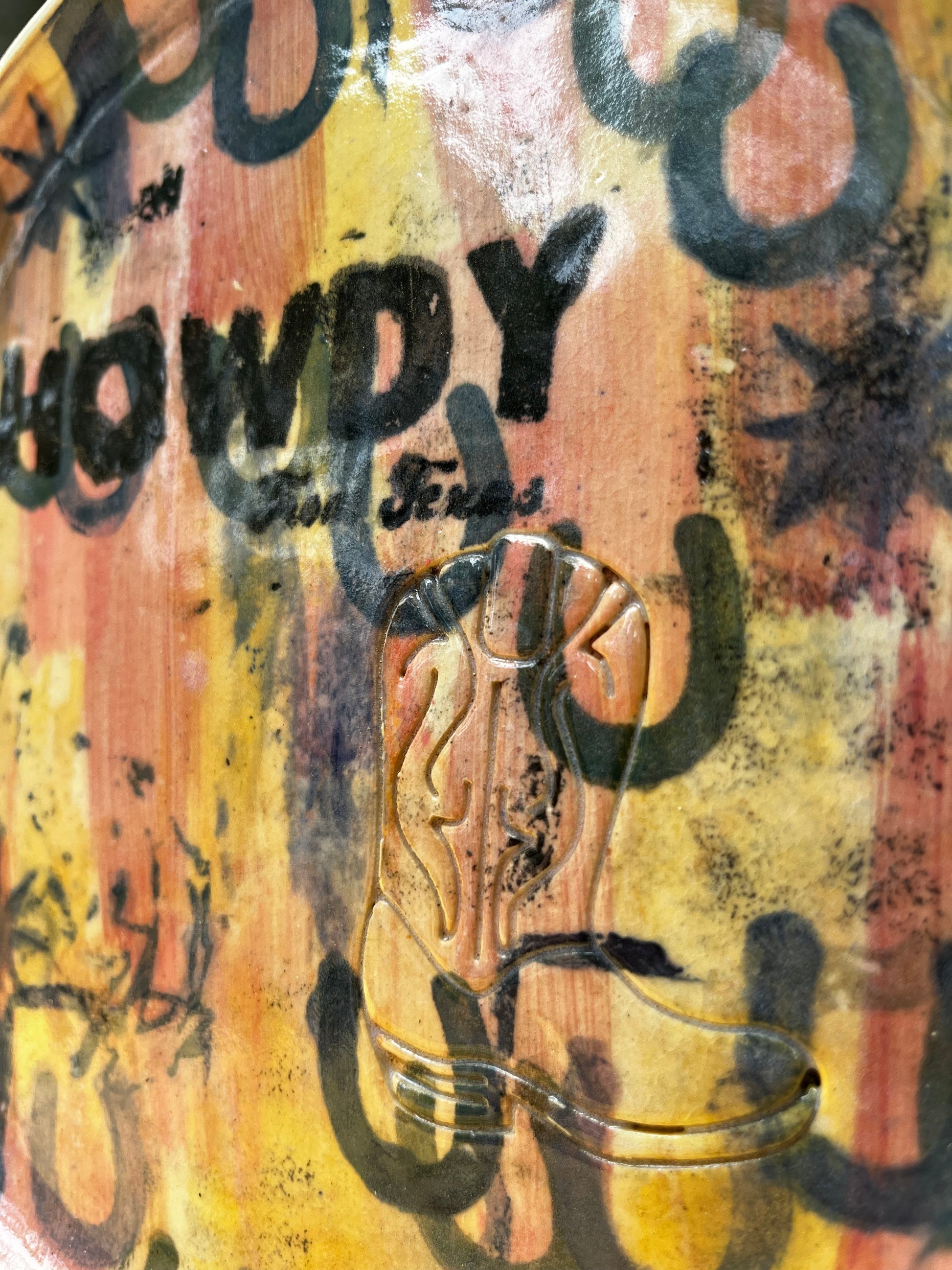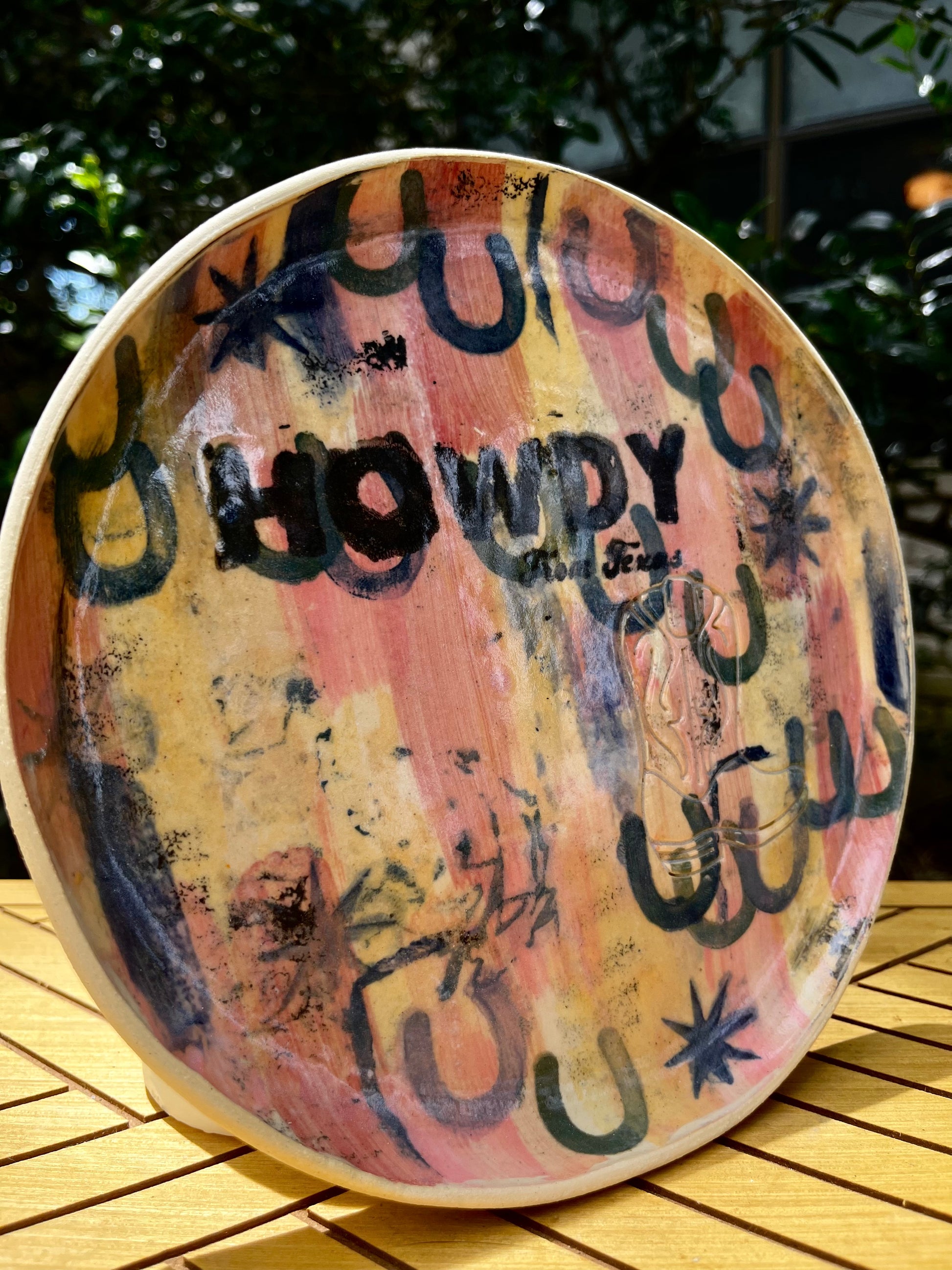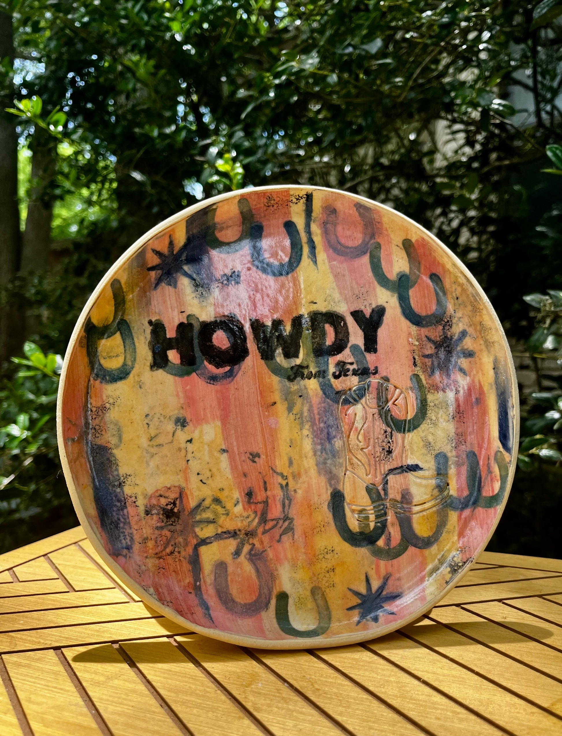 This hand painted and screen printed plate uses a variety of art techniques to create a layered design harking to an old wall thats been painted over and left to bake in the West Texas sun. There is a hand made boot stamped into the lower corner and the plate has a lip. Useable for dining, catch all trays or a wall hanging.