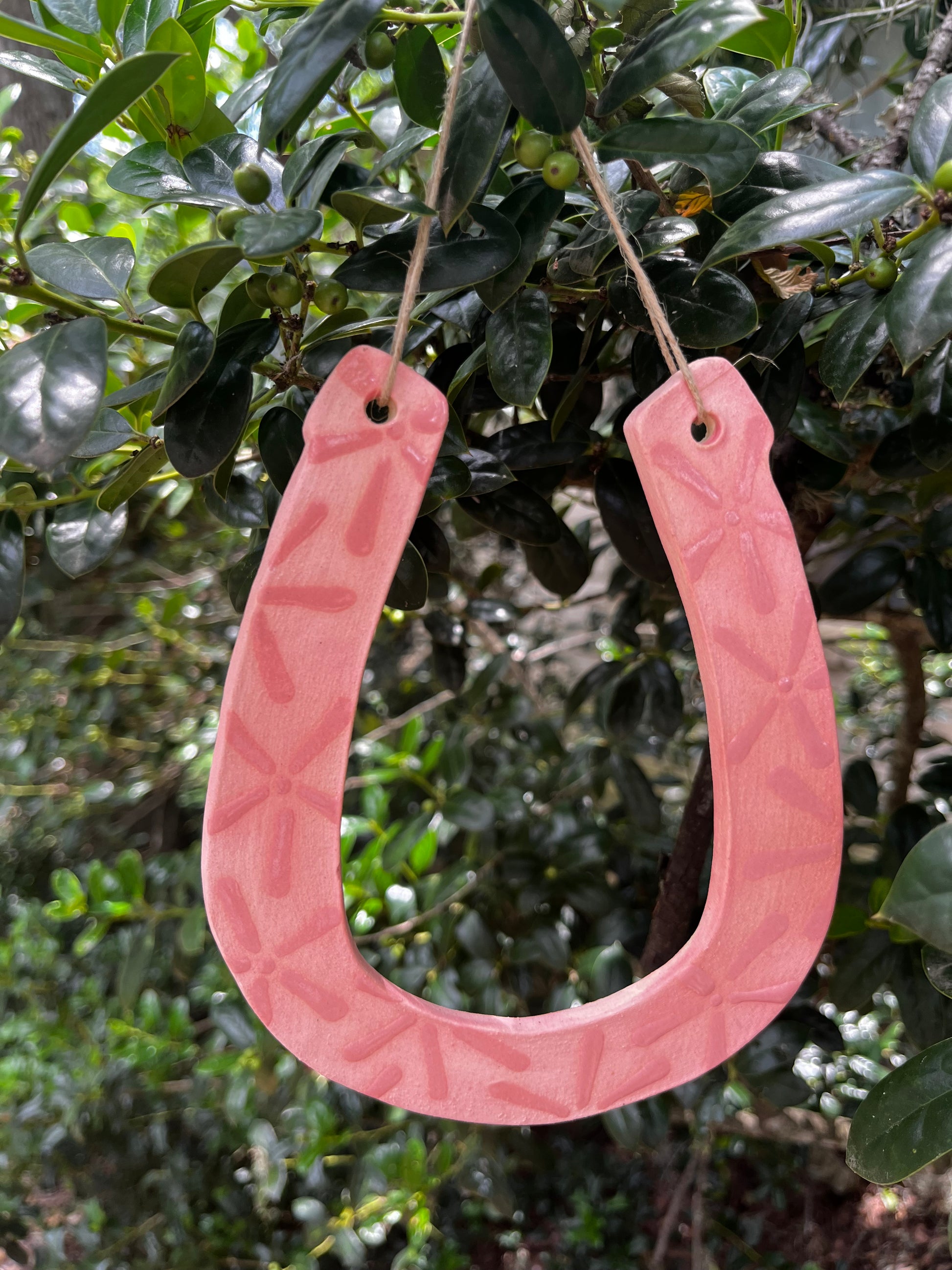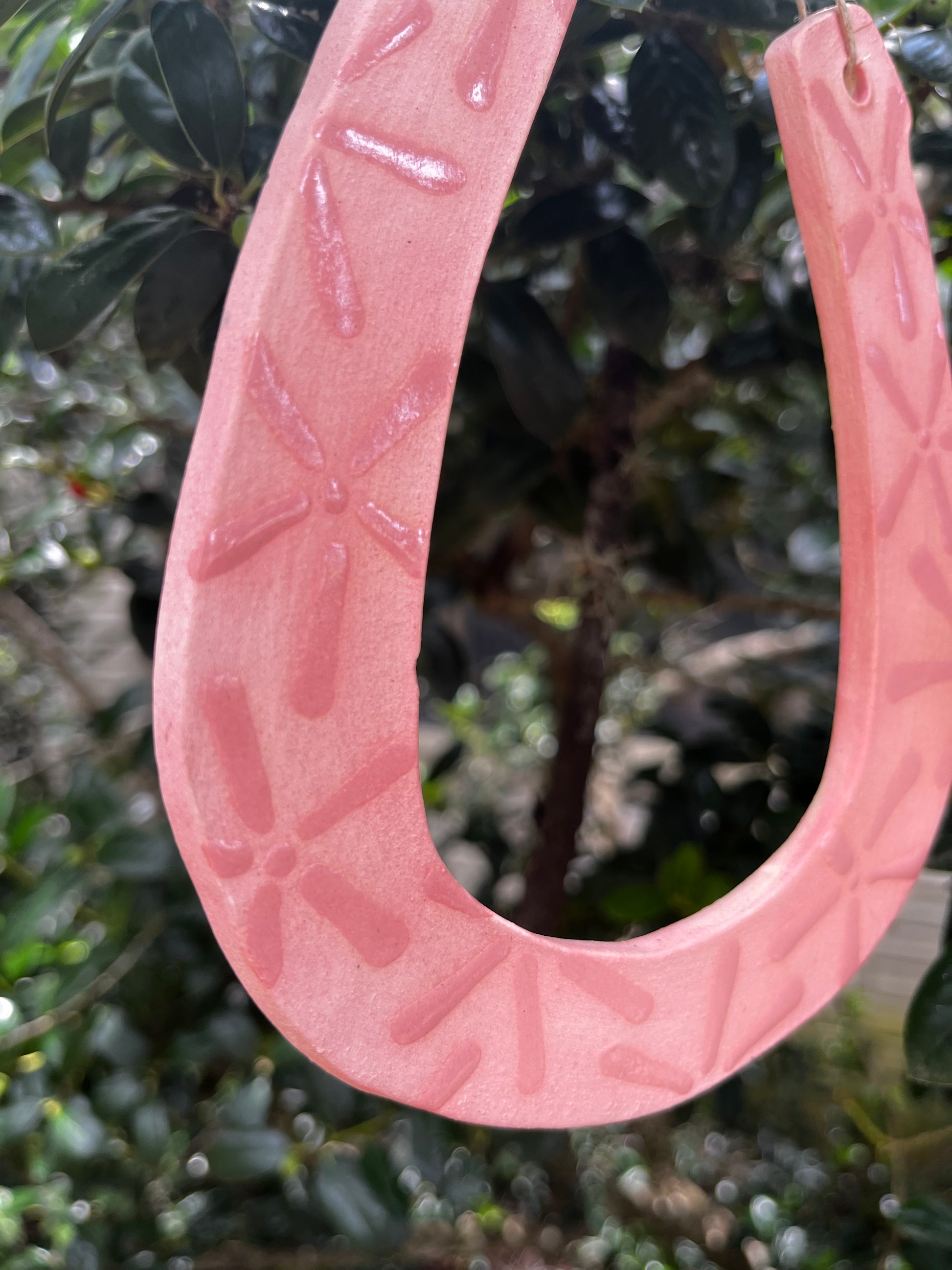 This floral horseshoe wall hanging is built from Cinco Blanco Stoneware clay and decorated with two types of pink glaze. 6.5"x4.5" and hung on natural hemp cording.