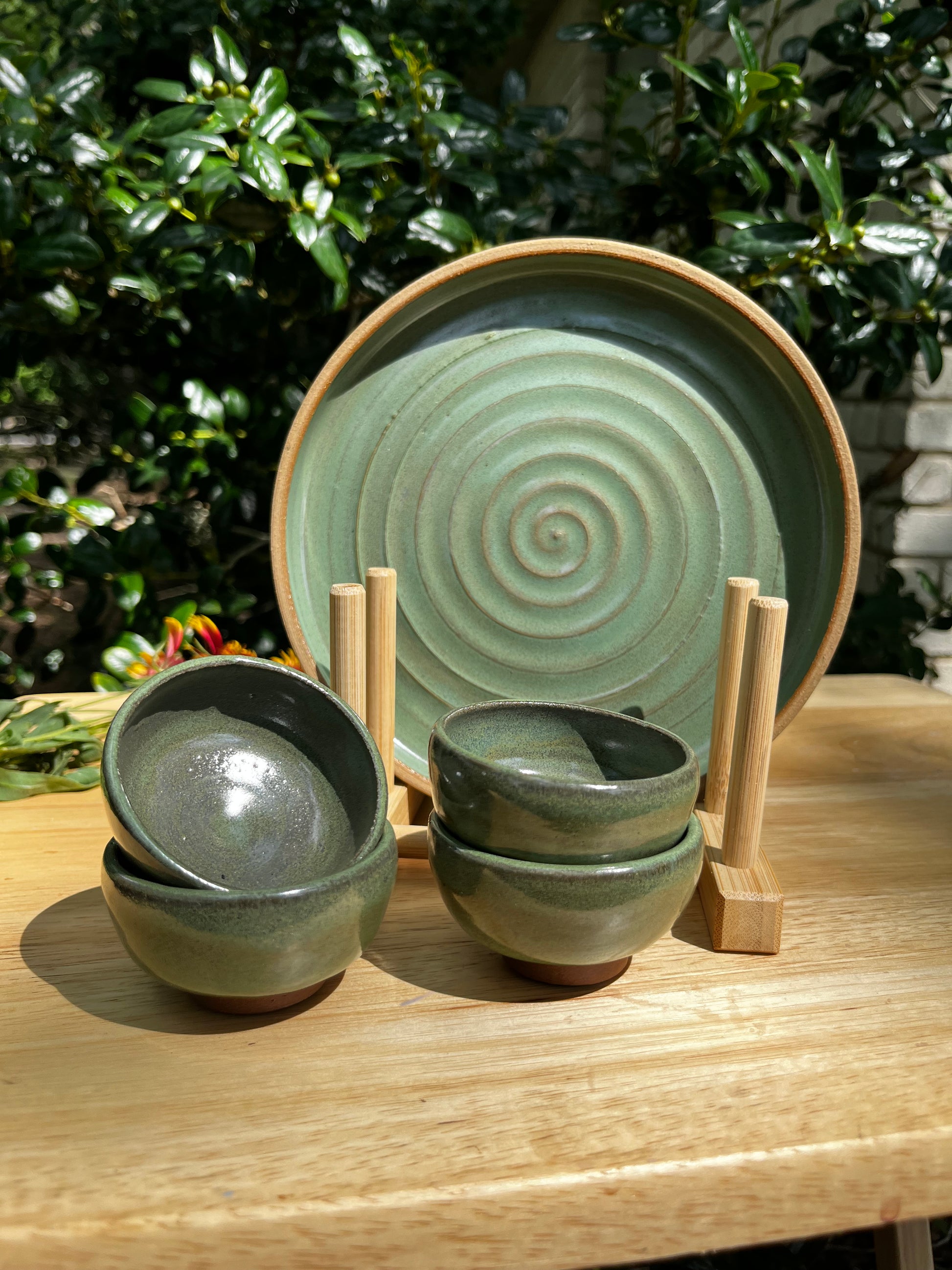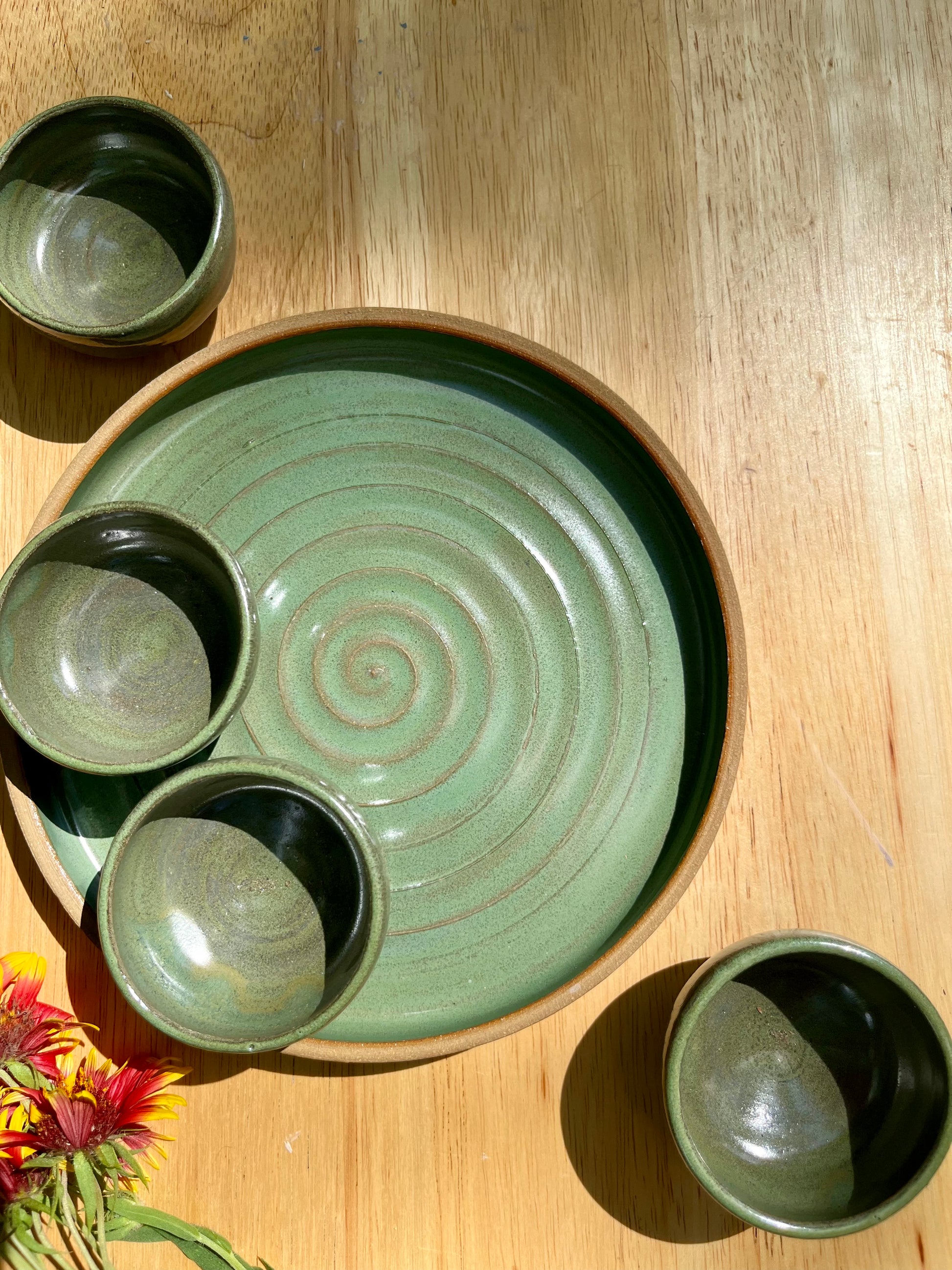 This thrown stoneware copita set is 6.6" in diameter and the copitas hold 1.5oz for your sipping, saucing, or sorting needs. Glazed in Lead Free, Non Toxic and dishwasher safe glaze over recycled stoneware clay.