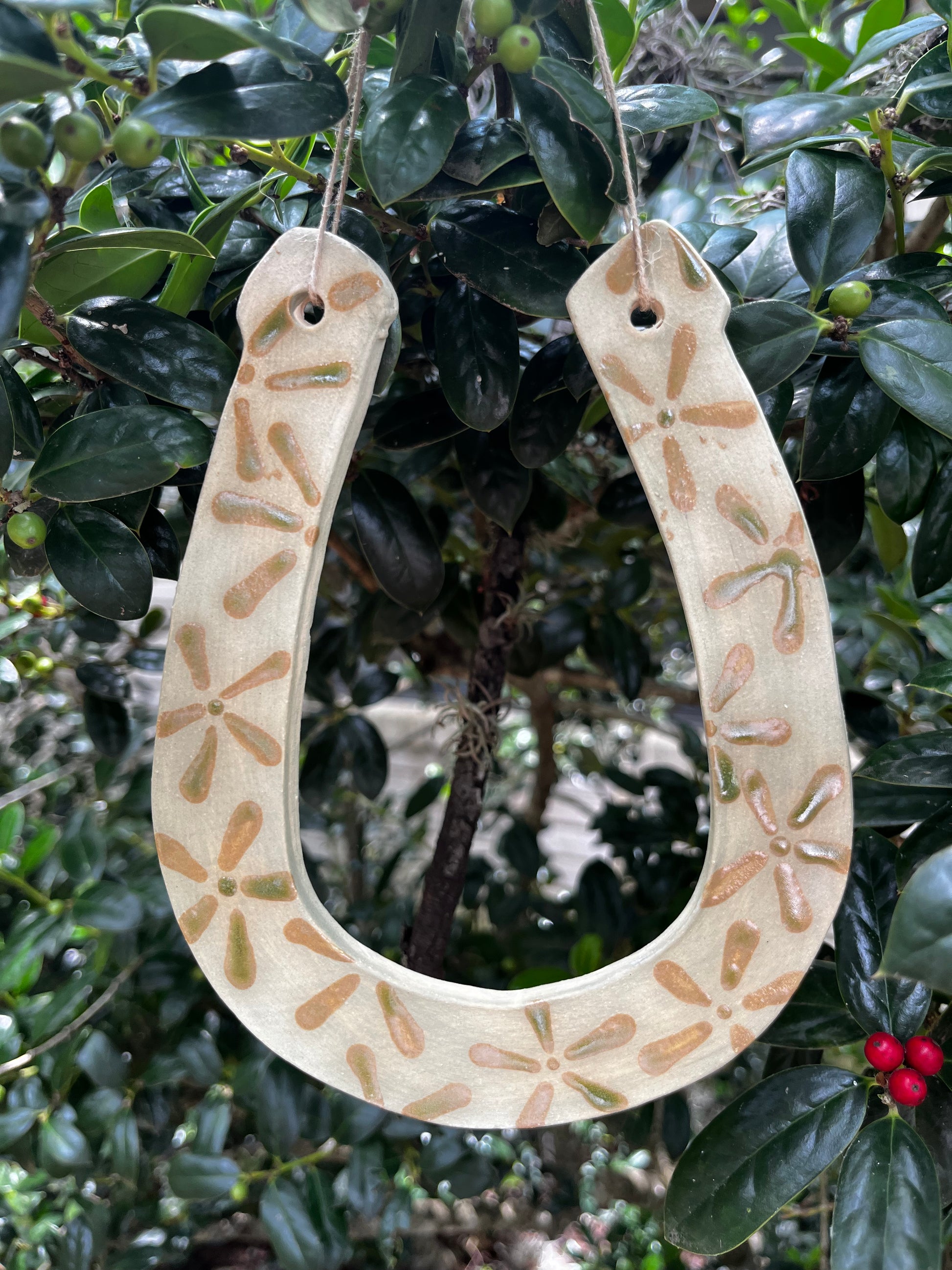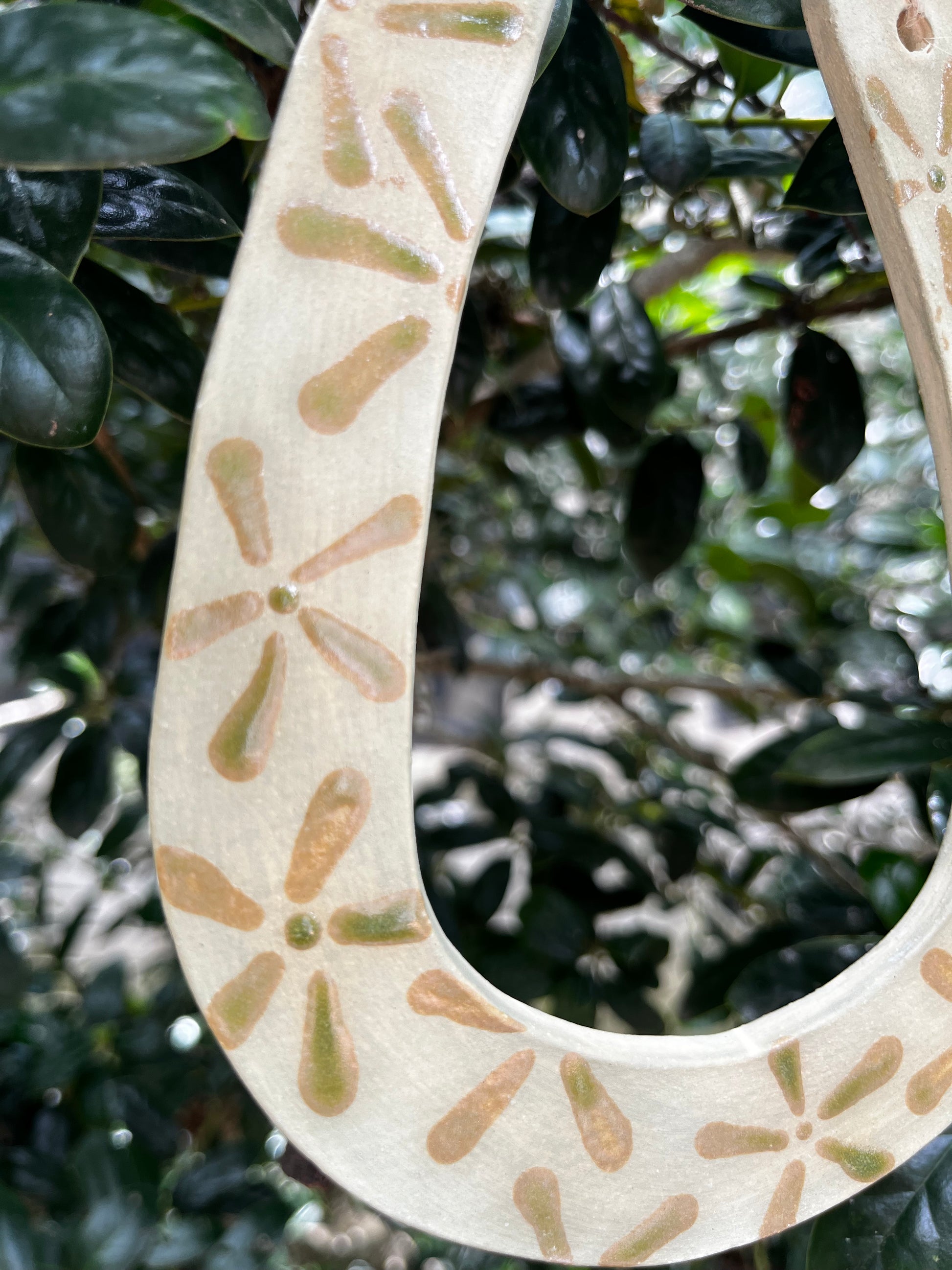 This wall hanging is painted with a floral pattern out of two green glazes. Built from Cinco Blanco Stoneware clay and hung from natural hemp cord. 6.5"x4.5"