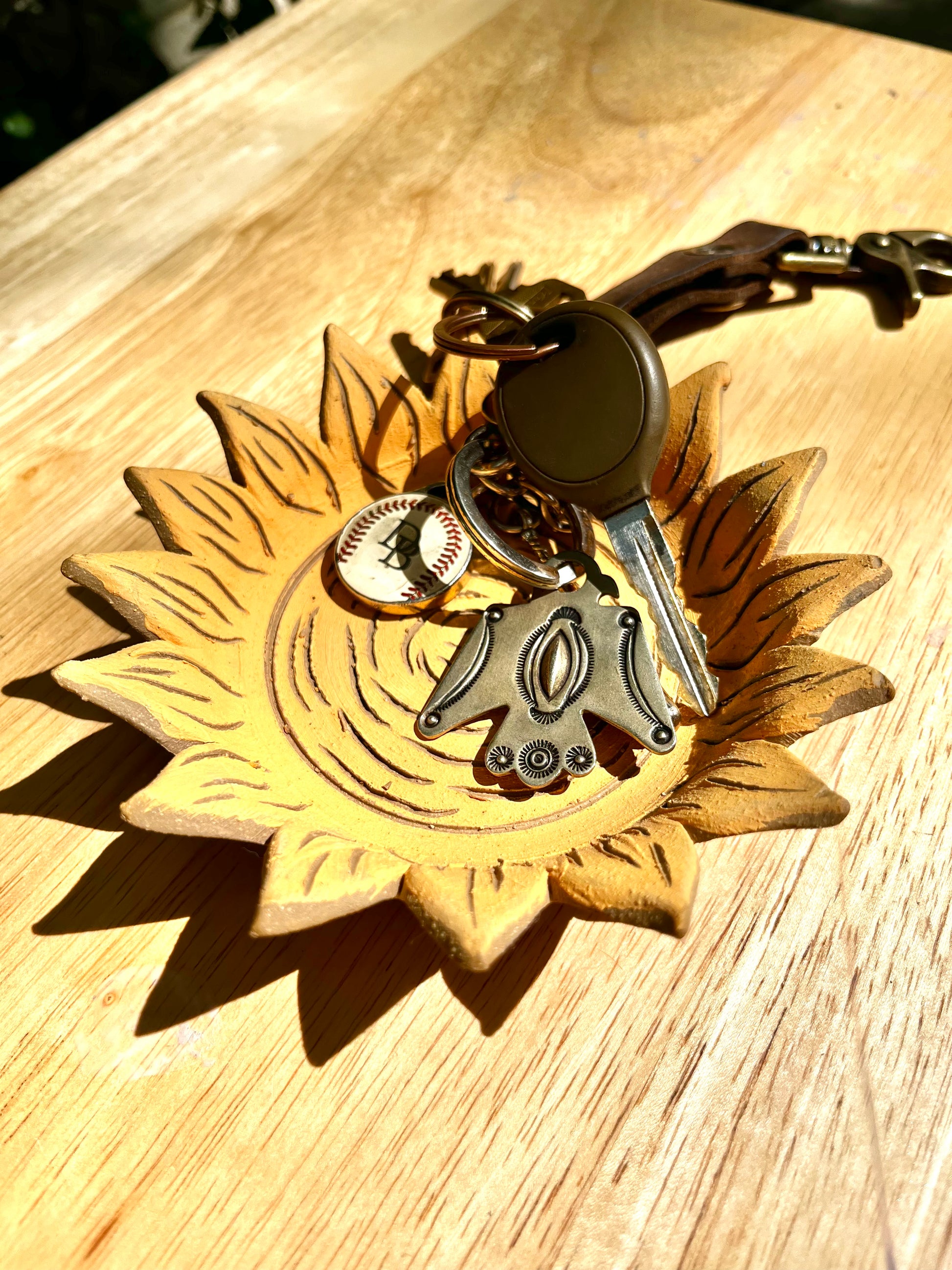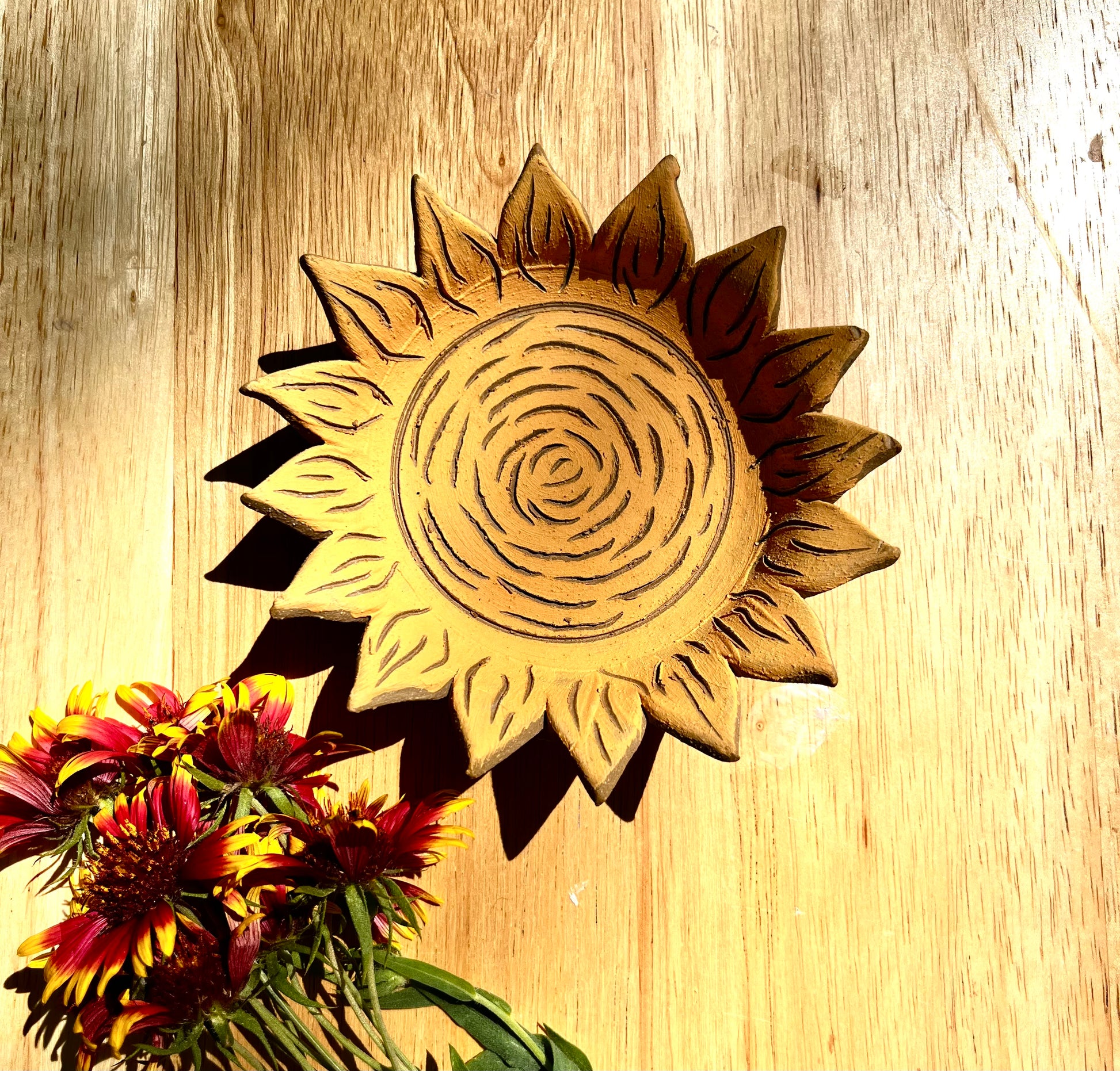 What a reminder to be the light in the world and always go towards the sunnier side of life. These darling hand built trinket trays are cut and shaped before a colored clay is painted on and then carved back for the design. There is no glaze on this tray but the clay is fully vitrified at 2200*F so they are still washable! The perfect place to put your keys or jewelry, incense cones, or whatever magical trinket your heart desires. Measuring just over 4.5" in diameter and 1.5" tall.